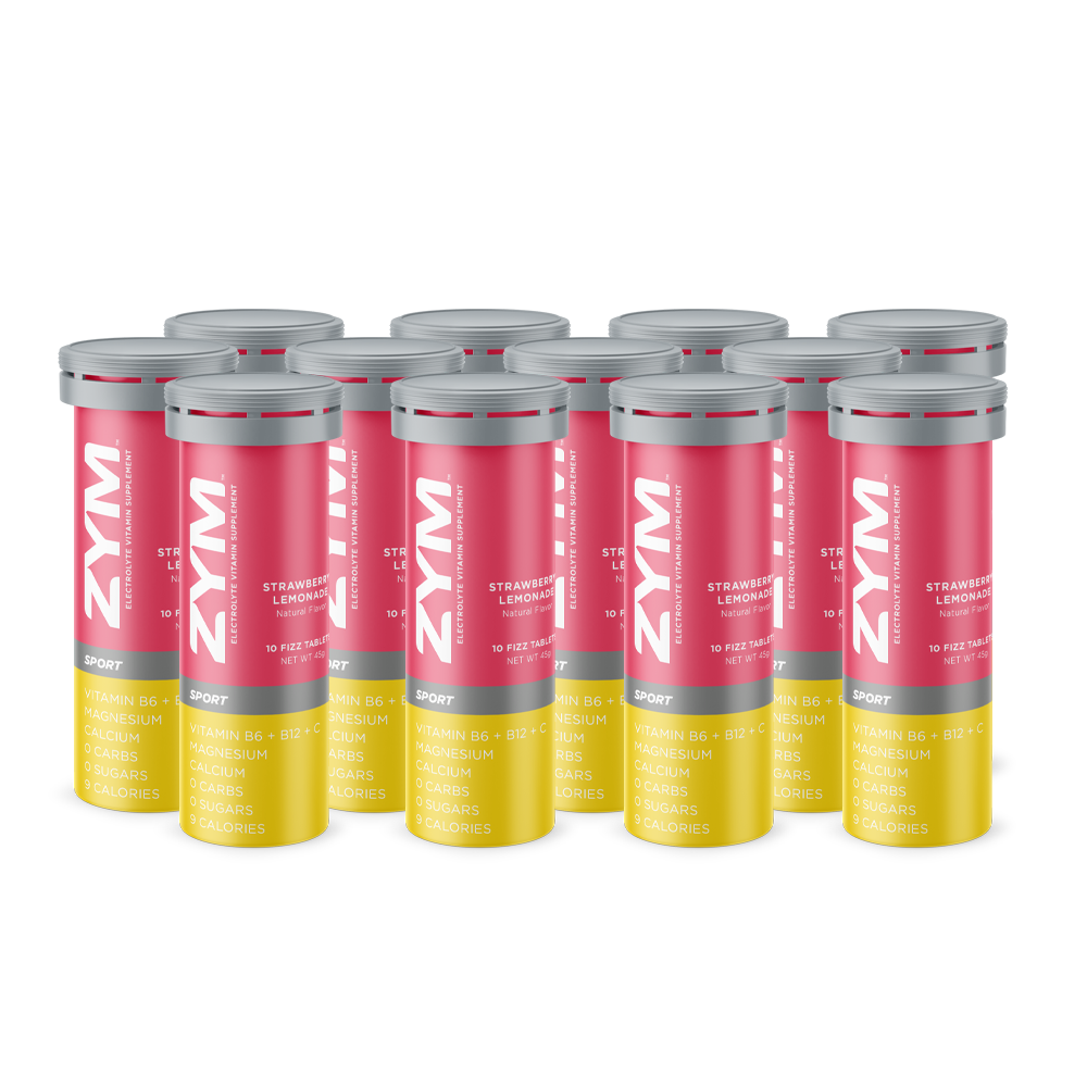 ZYM STRAWBERRY LEMONADE, with natural strawberry and lemon flavors, has a light + fresh strawberry taste with a pinch of juicy lemon, and is designed to combat fatigue, muscle cramps and lactic acid build-up. This is an Electrolyte Vitamin Supplement, containing better ingredients, no sugar, dissolves faster, has added vitamins, and tastes far better than any electrolyte tablet on the market. Truly, the taste of ZYM SPORT blows away the competition.